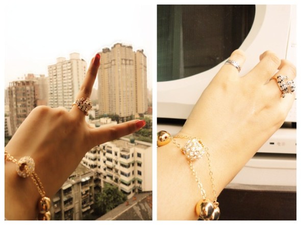 水钻手链 上面同时配了6个金色的小珠子 中间是个水钻珠子 我一直对小珠子状的东东很感冒~觉得不挑人 不过时 这款手链最让我满意的地方其实是它人性化的可以调节大小 很细或者很粗的手腕也能戴 当然有个宽松或者紧凑的区别