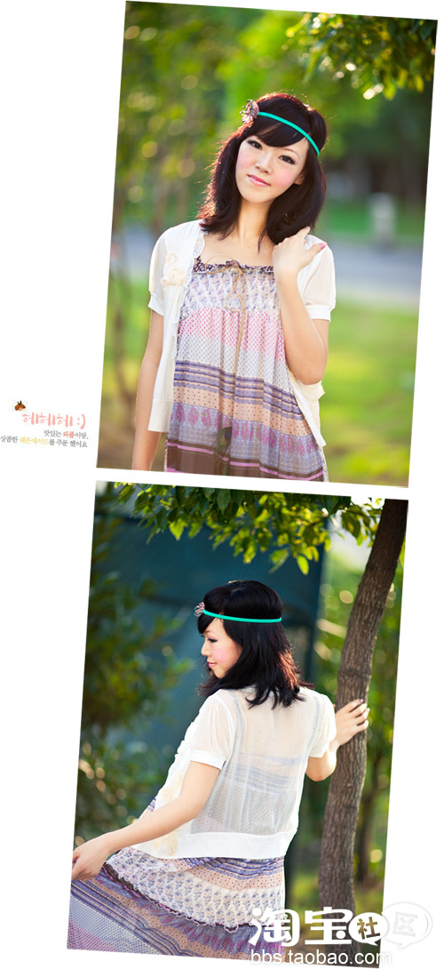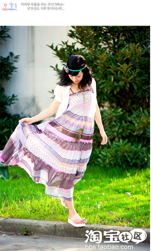 波西米亚紫色花色条纹雪纺连衣裙配上白色泡泡袖木耳边棉质小外套,是8月初秋出游的好选择。长裙搭配白色泡泡袖木耳边棉质小外套,既给裙子增添美感,又可以给自己的肌肤遮挡太阳光,手臂粗的美眉还可以遮手臂上的肉肉哦。波西米亚长裙的飘逸展现女孩优雅又甜美的完美气质,性感的她可以增添女孩随意又浪漫的异域风情配上白色小外套,花朵软拖鞋,民族发箍,这些都能为整体增色不少又看上去非常协调哦