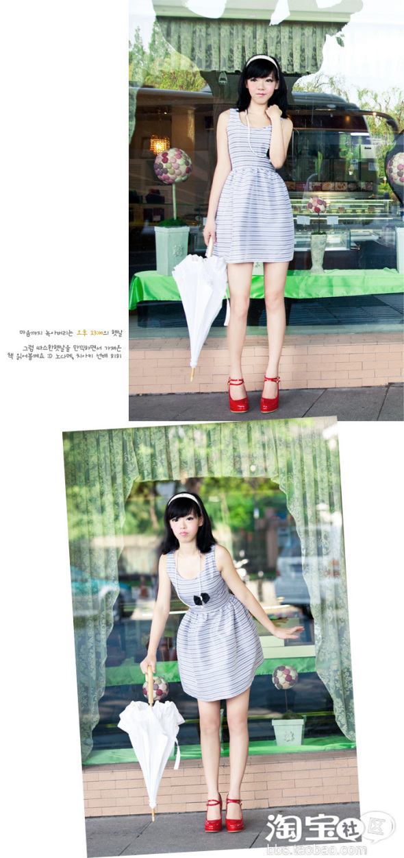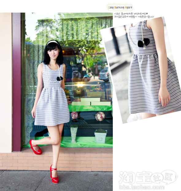灰白条纹背心式高腰典雅宫廷公主连衣裙搭配上了珍珠长项链,上面还有黑色的蝴蝶结哦,