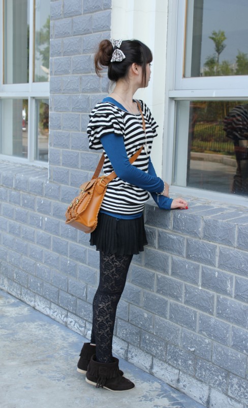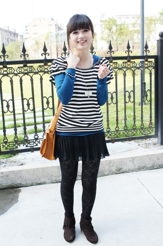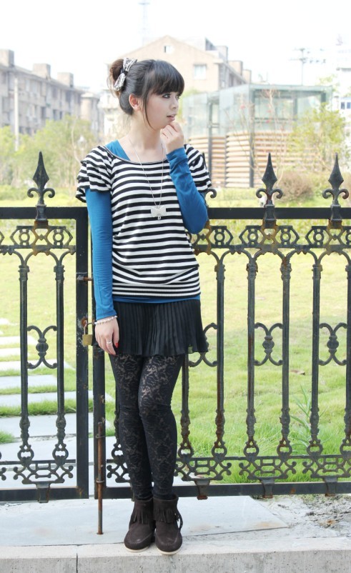 黑白蓝强烈对比+雪纺百折裙+蕾丝打底