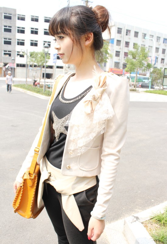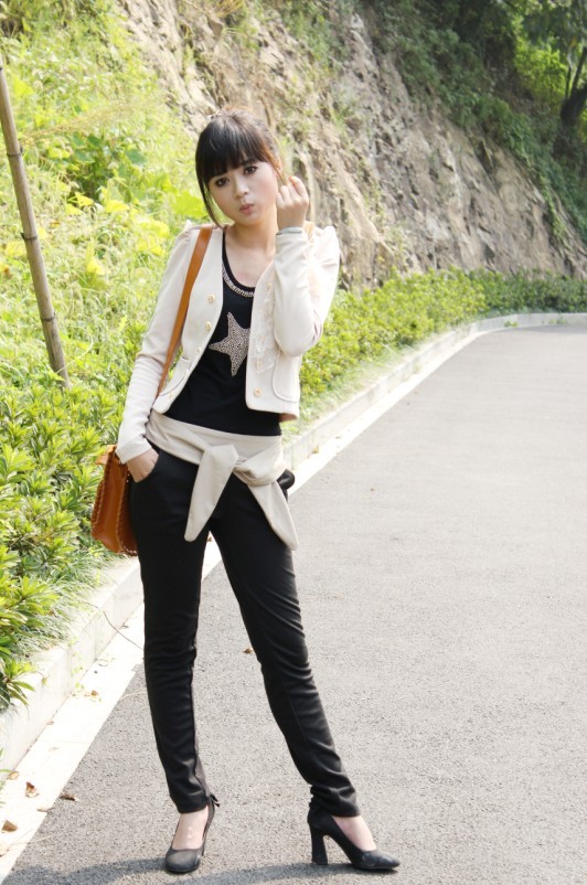 黑色的短款西服线条简洁,搭配雪纺质地裙子增加了些许柔美感觉。