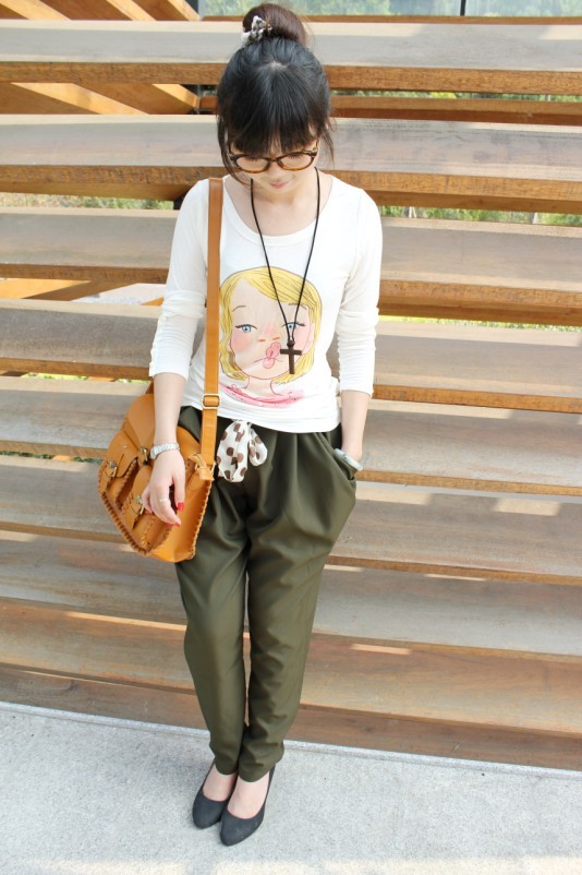 白色的鬼脸娃娃T+军绿色休闲哈伦裤