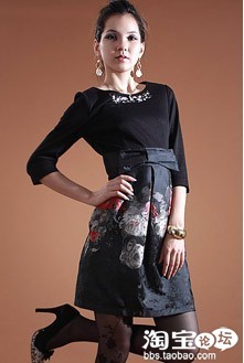 NO.10高贵的丝绒搭配丝质的提花面料 它的贵气您可以从面料上就感觉得出 质感光泽抢眼 丝绒的泡泡袖有点欧美风格 但收腰的A字裙摆与上胸围的面料拼接圆弧又让人想到中国风的旗袍 古典与现代/时尚与艺术的结合 搭配同系胸花更显小女人可爱一面!