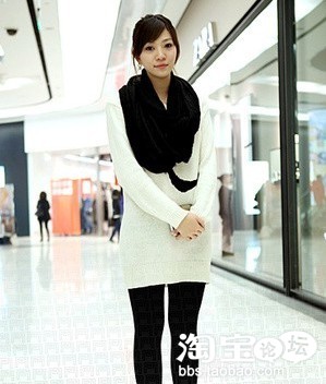 白色的针织衫,看起来非常的普通,可是搭配上黑色的宽大围巾后,声色不少,,,黑色的底裤,,黑色的漆皮鞋,整体简单干练,,是今年秋冬超级妹妹逛街的必备品奥。。。。而且搭配上这款黑色的围巾,可以恰到好处的来修饰一下美女的清瘦奥。。(别看这丫头挺清纯的,,其实也很野蛮的奥。小声点,,别让她听到,,会打人的。