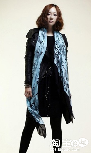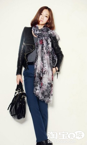 很沉稳的装束,黑色皮夹克很有朋克的感觉,藏蓝色的直筒裤剪裁整齐又修身,华丽的水墨图案纱巾为全身做了最好的点缀,可以说抢尽服装的风头,淡雅的水墨画处理唯美至极,让这身休闲装一下子变得高雅许多,纱质灵动的质感将整身原本硬朗的装束点缀的柔和了许多。