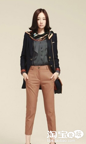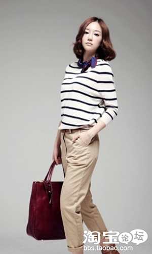 很简约的搭配,黑白条纹T恤简洁明快,米色休闲裤比较宽松,穿着起来十分舒适,可将裤腿卷起显得更加随意,小巧的蓝紫色方巾不太显眼却是整体不可缺少的一部分,他给形象增添了成熟的感觉,蓝紫色跟玫瑰红交错,让这身浅色服装搭配也具备了成熟女性该有的沉稳。