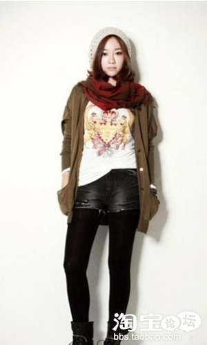 很可爱具有潮流感的装扮,深驼色的针织外套温暖又舒适,搭配印花T恤跟黑色磨白仔裤俏皮可人,红色的流苏围巾大气又时尚,暗红的色调不是很抢眼,却很能彰显小女人气质。