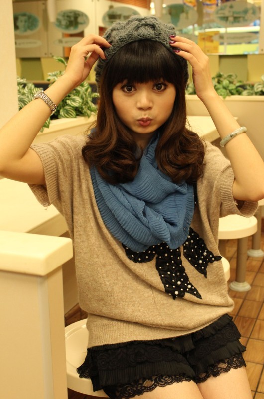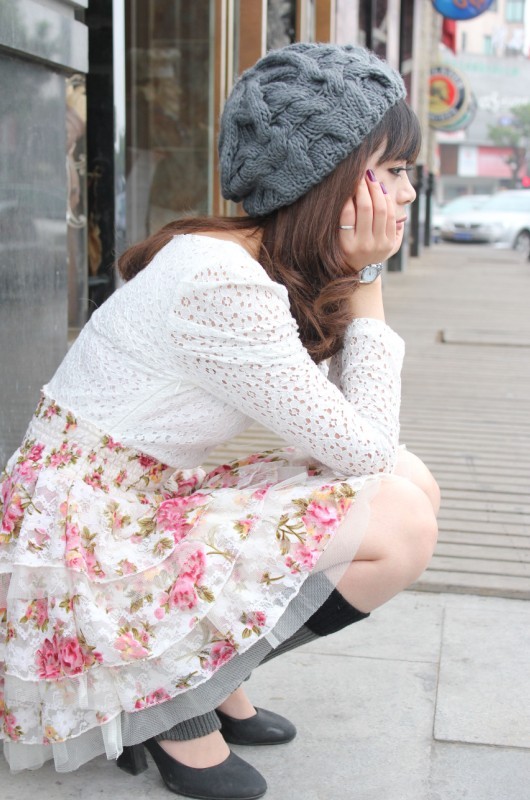 宽松的灰色毛衣混搭黑色蕾丝裤裙,别有一番清纯淑女的校园风情哦~~