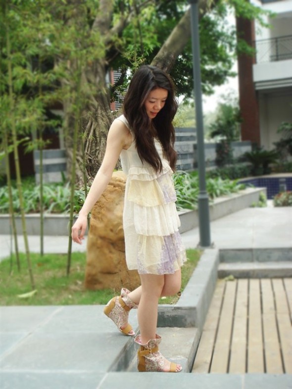 桃红色的鱼嘴涼鞋,粗跟的,本时不怎么喜欢穿高跟鞋
