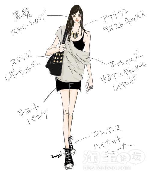 内穿黑色吊带,外套斜露肩宽松长tee,下穿黑色短裤,黑色高腰sneaker,黑色包包~~~至于脖子的配饰嘛,来个印第安风的不错~~