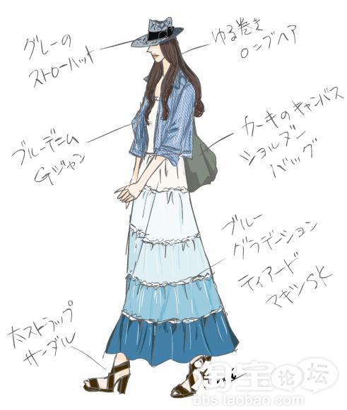 内穿蓝色段染长裙,由上到下,蓝色由浅至深.外穿浅色牛仔短款夹克,不过鉴于这种天气,还是别穿了,或者套个差不多的薄面料的,免得玉臂晒了~~