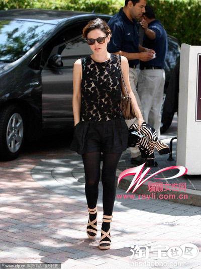 具有通透感的蕾丝背心透出性感的内敛。条纹外套也是随性之选。裸色绑带凉鞋是整体的焦点,赚足回头率。