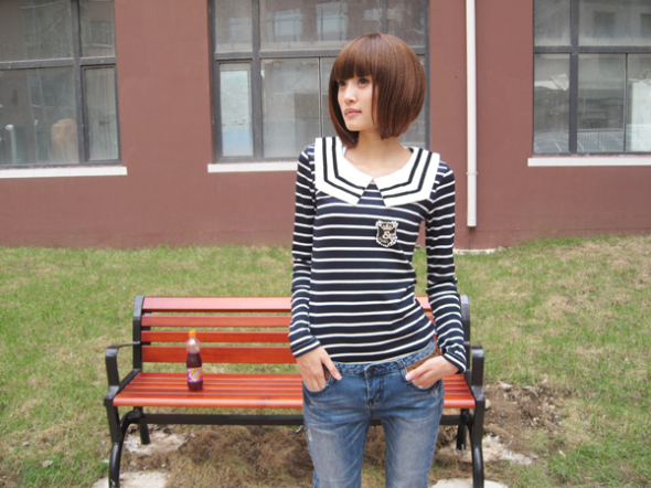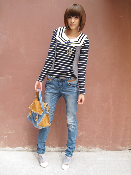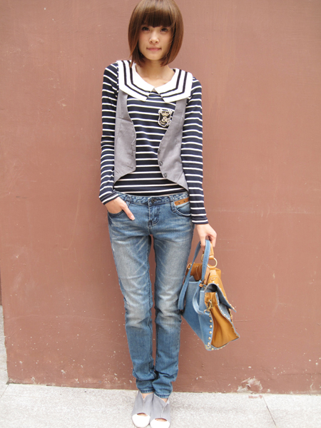 TOP,5 条纹海魂衫+修饰马甲+韩版小脚裤+铆钉牛仔包包