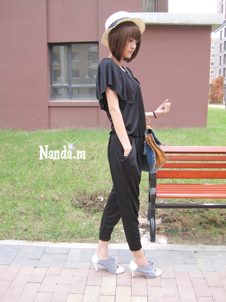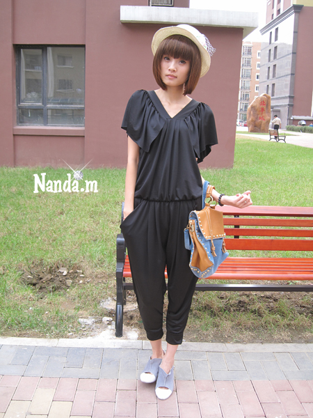 TOP,7圆边草帽+黑色荷叶边连体裤+包包