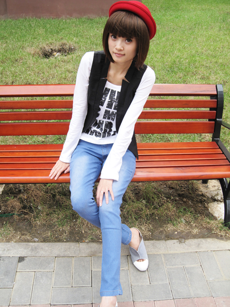 TOP,6 红色礼帽+黑色马甲+白色T+牛仔窄脚裤