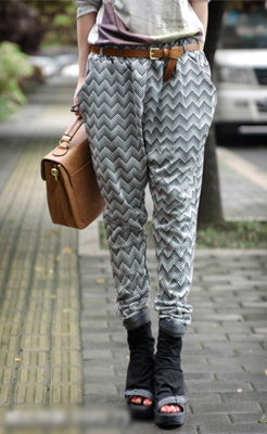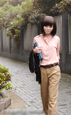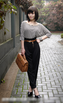 横条蕾丝领子的蝙蝠衫+高腰花苞裤 系个皮带~拎个复古包包 很有感觉哦~