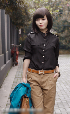 黑色的衬衣 立领的 还有肩膀的肩章~好喜欢哦