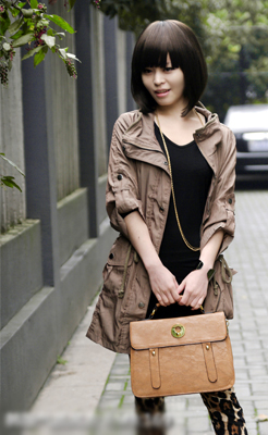 卡其色的油光面料风衣 很随意的穿~就可以哦~款式也很好 喜欢它的袖子~嘿嘿