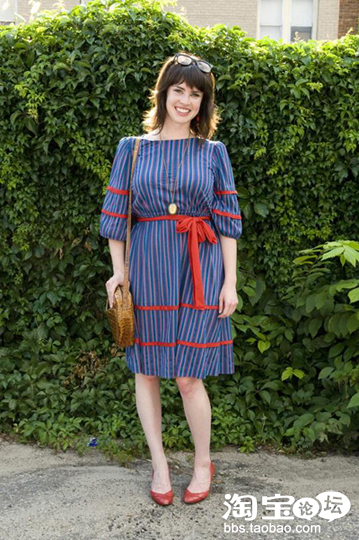 条纹裙复古韵味浓郁,红色的线条点亮色彩。简单的红色单鞋不抢戏,但不可或缺。