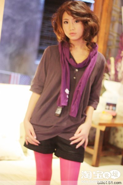 下摆鱼尾型的T,灰色是基调色,配上糖果色的袜子,紫色的围巾,感觉一下子就明朗了。