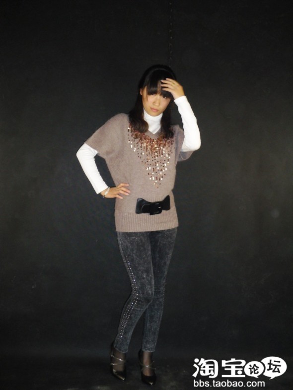 兔毛蝙蝠毛衣+白色打底衫+黑色牛仔打底裤=潮