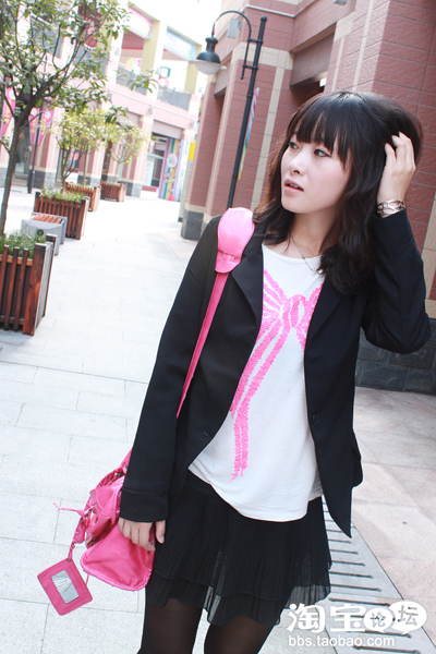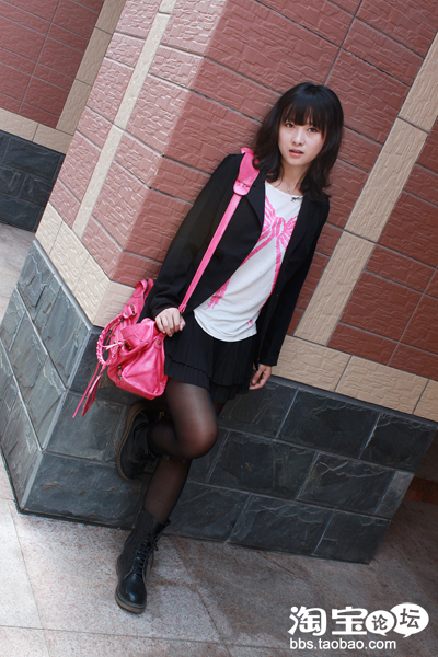 1.长款西服+粉色图案tee+机车包+短裙+马靴