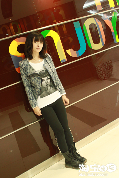 4.水洗扎染牛仔机车外套+白色tee+打底裤+机车靴