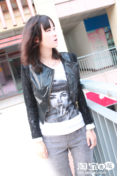 5.蕾丝皮衣+白色tee+灰色牛仔裤+厚底鞋