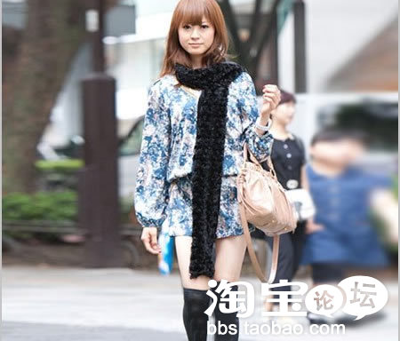 夏末的碎花长T来不及收到衣柜,采用一些小搭配将长T的寿命延长到秋季吧!围巾是必不可少的单品,可选择材质较厚的毛线围巾,将漂亮的下摆垂到腿部,过膝的长筒袜也是保暖的单品。