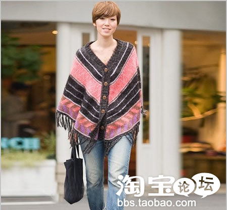 设计和剪裁另类的服饰总会夺人眼球,披肩的选择,十分适合手臂较粗,或者腰线圆润的女性,高挑的身材将披肩的流畅线条展示的十分飘逸,质朴的牛仔裤搭配更是烘托出披肩的休闲趣味。