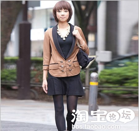 色彩在服饰的搭配中起着至关重要的作用,一身服饰的搭配颜色应该尽量控制在三到四种,单色的搭配难免有些许单调,而运用两种色彩进行互补搭配则是十分明智的,黑色的性感和赭石色的舒适搭配起来十分适宜还透着些许英伦气质。阔领西装与黑色打底衫将视线集中在漂亮的项链上,短款褶裙却淡化了西装的古板和单调。