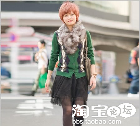 经典的菱形图案针织衫怎么搭配都好看,如果感觉纱裙太冷,牛仔裤,卡其裤都是非常不错的选择,皮草围巾十分保暖,将模特的脸色也衬托的圆润可爱。