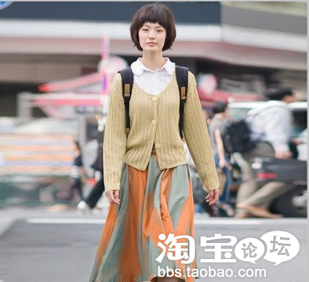 森林系女生是日韩今年十分流行的女生搭配,尽量选择那些具有返古意味的服饰,打造接近自然的发型和服饰,这位模特不注重奢华,选取简单的毛衣和长裙,别有一番风味在街头。