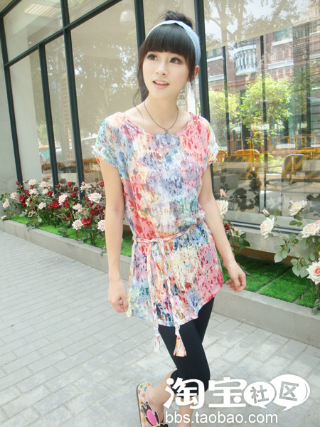 4.欧美风时尚幻彩渐变扎染色长T+牛仔发箍+冰丝打底裤 打造夏季欧美风