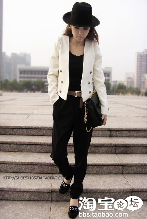 秋天 这样的呢外套是少不了的哦 很中性化 下面配一条简单的哈伦裤就会很显眼 黑白配的风格