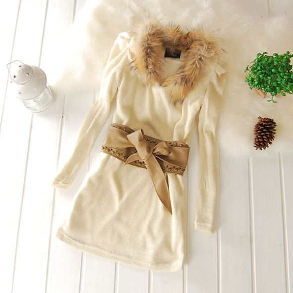 呵呵,有点另类哦,因为这个算不是真正意义上的毛衣,算个金丝线的针织连衣裙,不过真狐狸毛桃心领,配上仿皮蝴蝶结腰带,说不出的华美、温柔。优雅气质缓缓释放哦