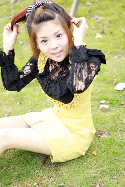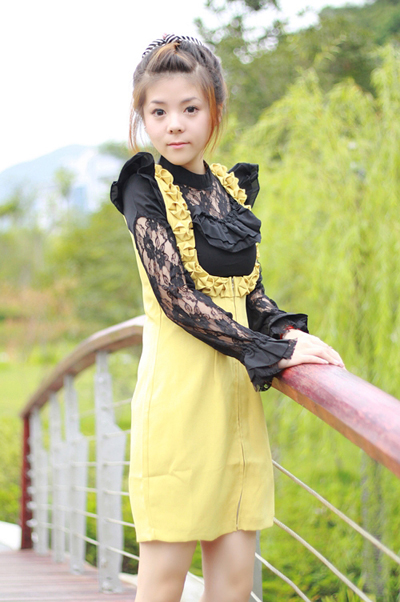 黄色花瓣背带裙+黑色蕾丝打底衫