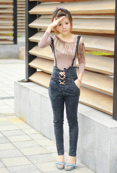 流苏胁肩T恤+显瘦高腰背带裤