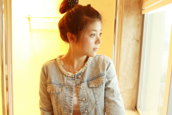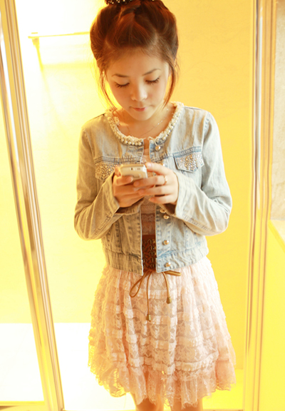 烫钻牛仔衣+粉色蕾丝裙