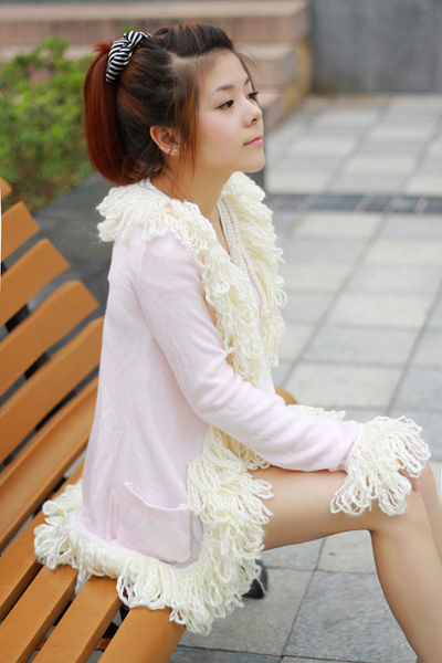 淡粉色流苏针织衫+白色珍珠打底衫+深灰色短裤