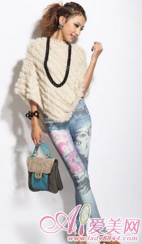 艳丽的碎花、迷惑的波普图案是不是都让你厌倦了呢?或许一个头像就能把你拉回服装时尚敏感度~美女头像印花,头像常见,但印在牛仔裤上的就极为少见哦~不易脱色,精致印花~清爽的浅蓝牛仔legging,磨白处理,适合秋冬搭配,前腿处的美女头像印花,屁股假口袋的个性设计,为裤子增色非凡。
