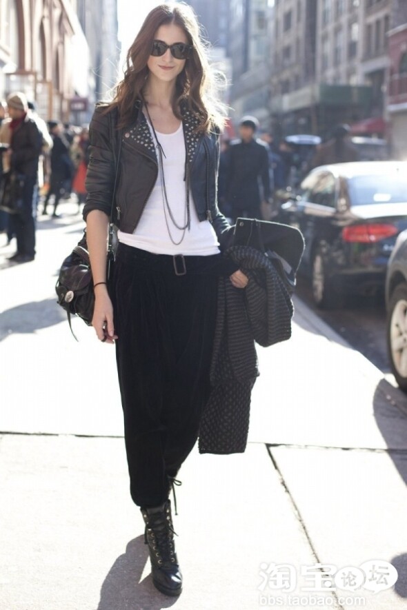 皮衣是首选的防风款哦,配上这大气的高腰裤,气质非凡,鞋子最给力了!