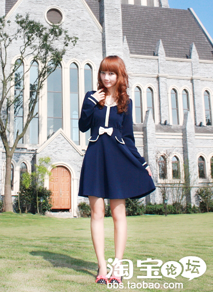 第五套学院风蓝色连衣裙+波点高跟鞋