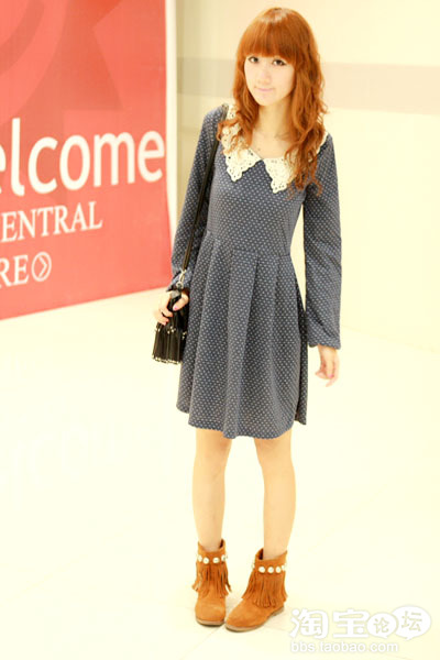 第十四套 蓝色波点收腰连衣裙+流苏短靴+流苏小包