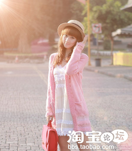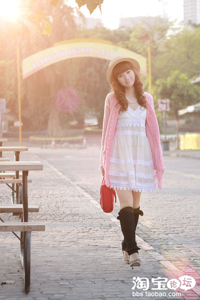 超级粉嫩的毛衣外套配上米白色的层层公主裙~