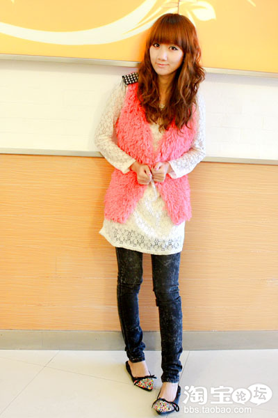 第十三套 粉色毛毛背心+白色蕾丝打底衣裙+黑色小脚裤