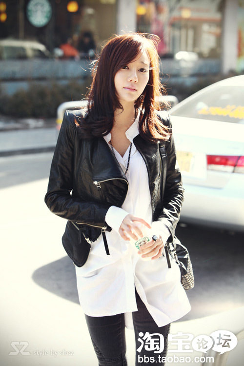 短款收腰的皮衣内搭配长款打底衫,既休闲又不容易暴露腰部缺陷,可以让中性风味的皮衣也充满了女人味。。。