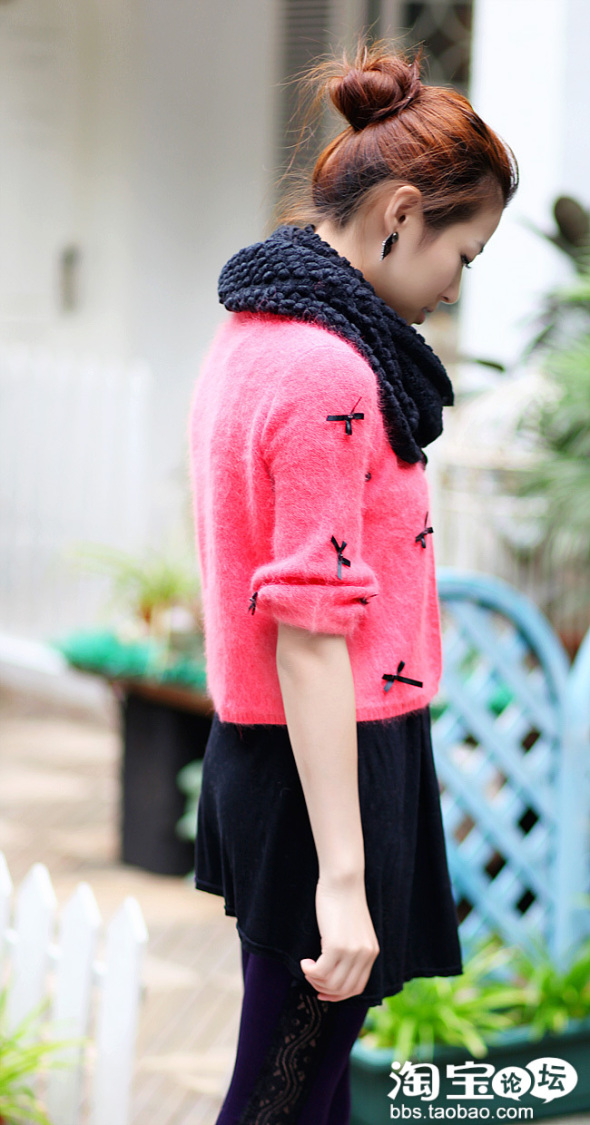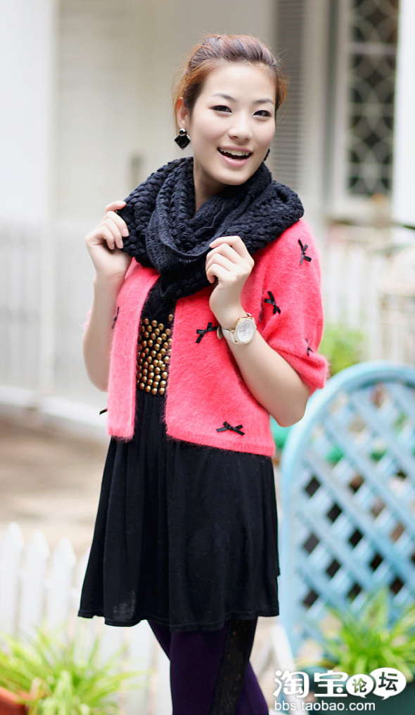 桃红色的兔毛披肩式开衫,衣服前片一个个小蝴蝶结装饰像在翩翩起舞,令甜蜜度加分不少呢!搭配上连衣裙和黑色宽松围脖,真是保暖又可爱哦,尽情向他展现你可爱甜美的一面吧!