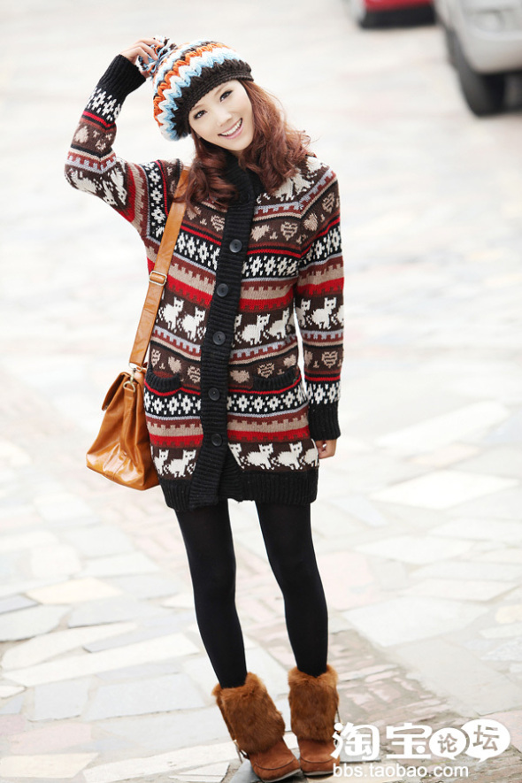 这样一款彩色图案的长款针织毛衣外套,是“乖乖牌”的必备了,只需简单的搭配上打底Legging+毛毛靴+毛线帽子就已经相当讨人喜欢了!