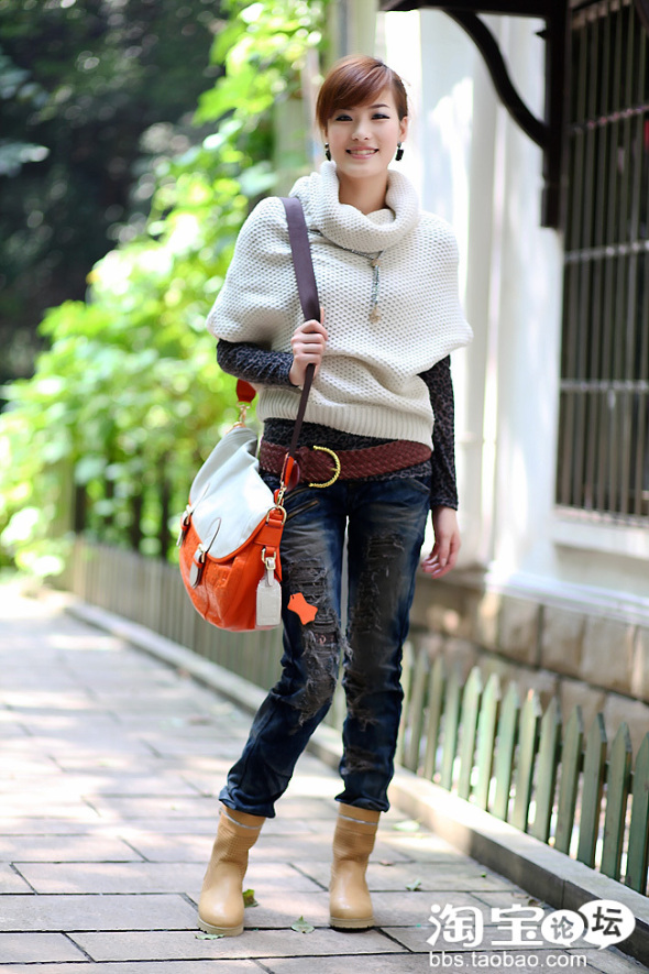 蝙蝠袖在今年又大热起来,松垮的宽松大领子将脖子拉出完美线条,里面搭配简单的打底T恤,当然皮带是一个亮点,再搭配上牛仔裤和短靴是不是既随意又个性十足呢!